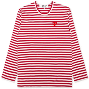 The CDG PLAY Big Red Heart Striped L/S T-Shirt (White/Red) is a perfect blend of comfort, modern design, and timeless